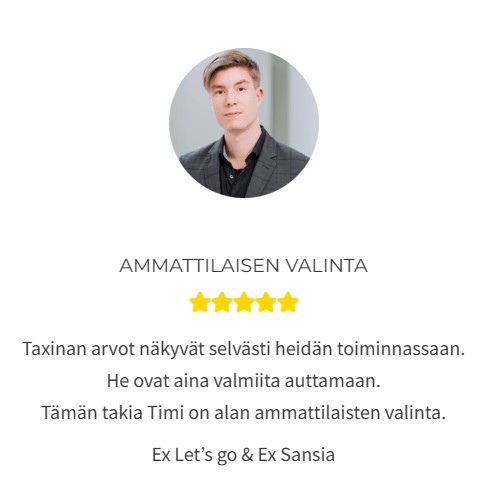 Taxinalla on Etelä-Savon tyytyväisimmät asiakkaat, salaisuus löytyy arvoista. Perustaja Timille tärkeintä on luottamus. Tätä luottamusta arvostamme ja vaalimme. Teemme kaikkemme sen eteen, että asiakkaamme saavat juuri sen mitä tilaavat ja kaupan päälle Mikkelin parasta palvelua!